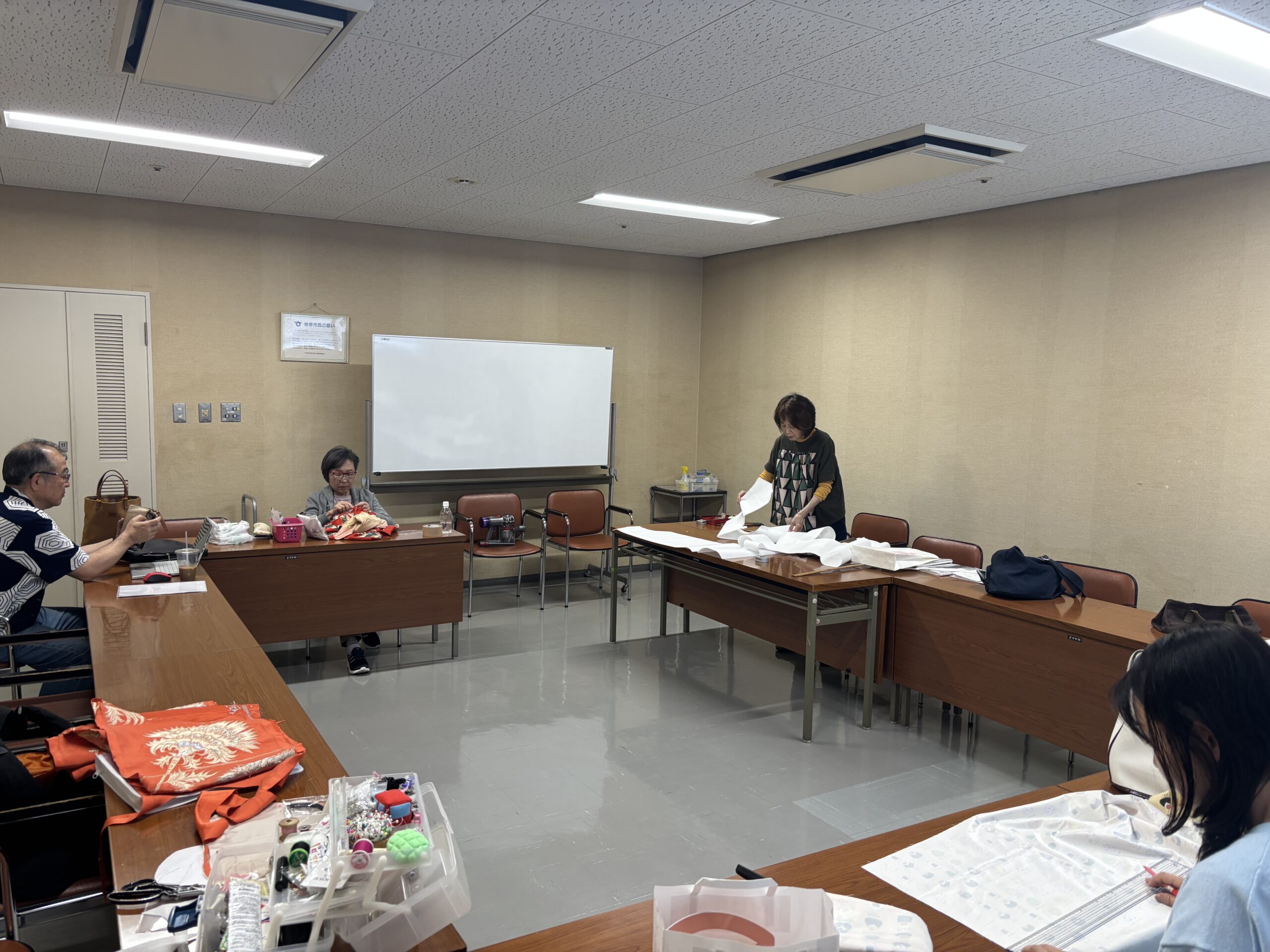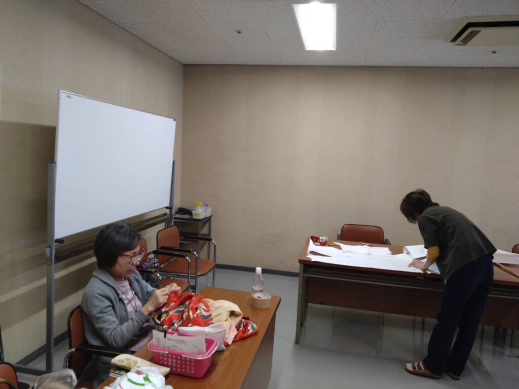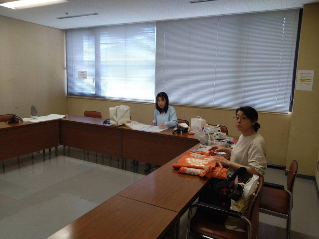 Kさんは引き続き羽織のリメイク。見返しと裏地を裁断しました。Iさんは、なんと、エコバッグのオーダーがまた入り、3つ目を作っていました。エコバッグのスペシャリストになりそうな勢いです。Hさんは帯を裁断してがまぐちバッグを作る準備です。今回もお喋りをしながら手を動かして、楽しい時間を過ごしました😀